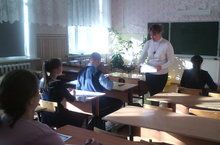 В рамках предметной недели учитель технологии и истории Бикулов М.П. провел урок истории в 6 классе. На уроке при изготовлении проекта помогали консультанты (учащиеся 10 класса). В конце урока учащиеся 6 класса защишали проекты , например: "Война...."