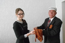 Председатель Совета ветеранов п.МЮД Лимонов Леонид Евгеньевич подарил Георгиевские ленты председателю Совета старшеклассников Бокаревой Елизавете в честь предстоящей 71 -годовщины Великой Победы.