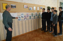 Учитель технологии Бикулов Марс Паймурзович демонстрирует учащимся 9 а класса фотовыставку "Трудом славен Человек!"