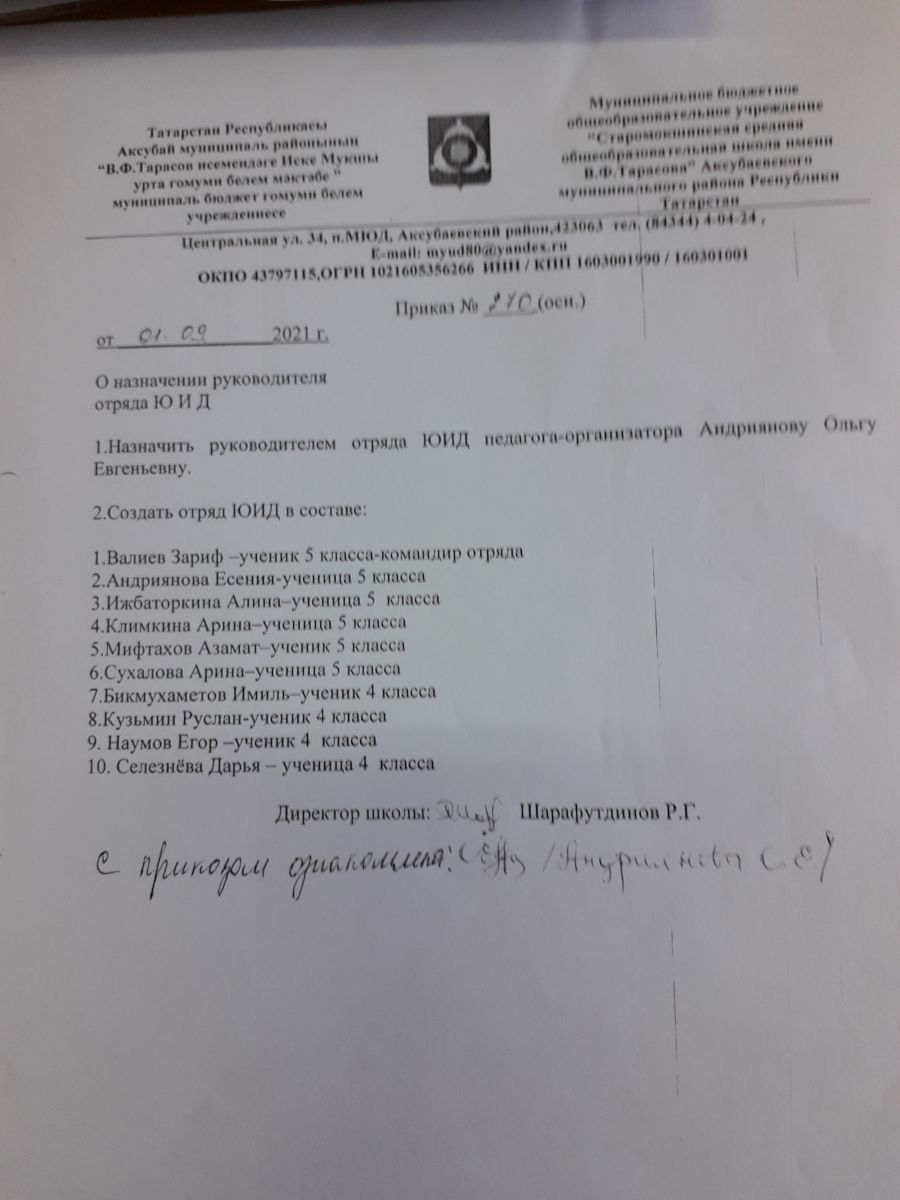 Приказ "О назначении руководителя отряда "ЮИД"