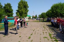 Учащиеся школы собрались перед зданием школы на торжественное мероприятие, посвящённое вступлению учащихся шестого класса в ряды юнармейцев.