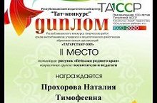 Воспитатель ГПД Прохорова Наталия Тимофеевна учавствовала в Республиканском конкурсе творческих работ среди воспитанников, учащихся и педагогических работников образовательных организаций "Татарстану-100!" и заняла 2 место в номинации рисунок "Пейзажи родного края".