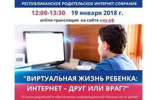 19.01.2018 с 12.00 до 13.30 состоится Республиканское родительское интернет-собрание «Виртуальная жизнь ребенка: интернет – друг или враг?». Он-лайн трансляция собрания будет вестись на сайте Казанского инновационного университета имени В.Г.Тимирясова по адресу: