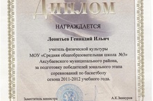 Дипломом министерства образования РТ был награжден учитель физической культуры Леонтьев Г.И. за подготовку победителей зонального этапа соревнований по баскетболу сезона 2011 - 2012 учебного года. Поздравляем!!!