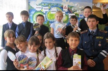 В рамках акции "Помоги первокласснику безопасно прийтти в школу" каждому первокласснику представители ГИБДД подарили подарки, памятки, браслеты, книги.