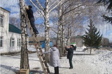 В завершении мероприятия все вместе вышли на улицу и повесили скворечники для наших пернатых друзей на берёзах перед школой.