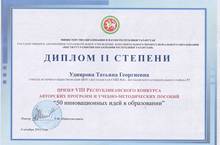 Дипломом II степени награждена учитель истории и обществознания нашей школы Удиярова Татьяна Георгиевна в VIII республиканском конкурсе авторских программ и учебно-методических пособий "50 инновационных идей в образовании".
