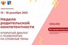 С 13 по 18 декабря 20212 года пройдет Неделя родительской компетентности – открытый диалог с психологом на сложные темы. Мероприятие будет проходит в онлайн-формате. Организаторы Недели: Министерство просвещения РФ, Московский государственный психолого-педагогический университет. Регистрацию можно пройти на сайтеБытьродителем.рф. Это новый формат, ориентированный на решение самых сложных вопросов развития и воспитания детей. Станьте соавтором Недели и определите, какую именно проблемную ситуацию рассмотрят специалисты на вебинаре. Что вас ждет: Вебинары по острым темам от ведущих экспертов; Разбор реальных проблемных ситуаций воспитания в прямом эфире; Участие в формировании полезного контента Недели; Открытый диалог с психологом – вы можете задать свой вопрос и услышать ответ в прямом эфире. В программу Недели включены такие сложные темы, как буллинг, половое воспитание, безопасность в интернете, сложности в обучении, кризисные ситуации в подростковом возрасте и многое другое.