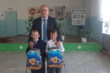 Представитель ОАО " Чистопольские электрические сети" вручает портфели первоклассникам.