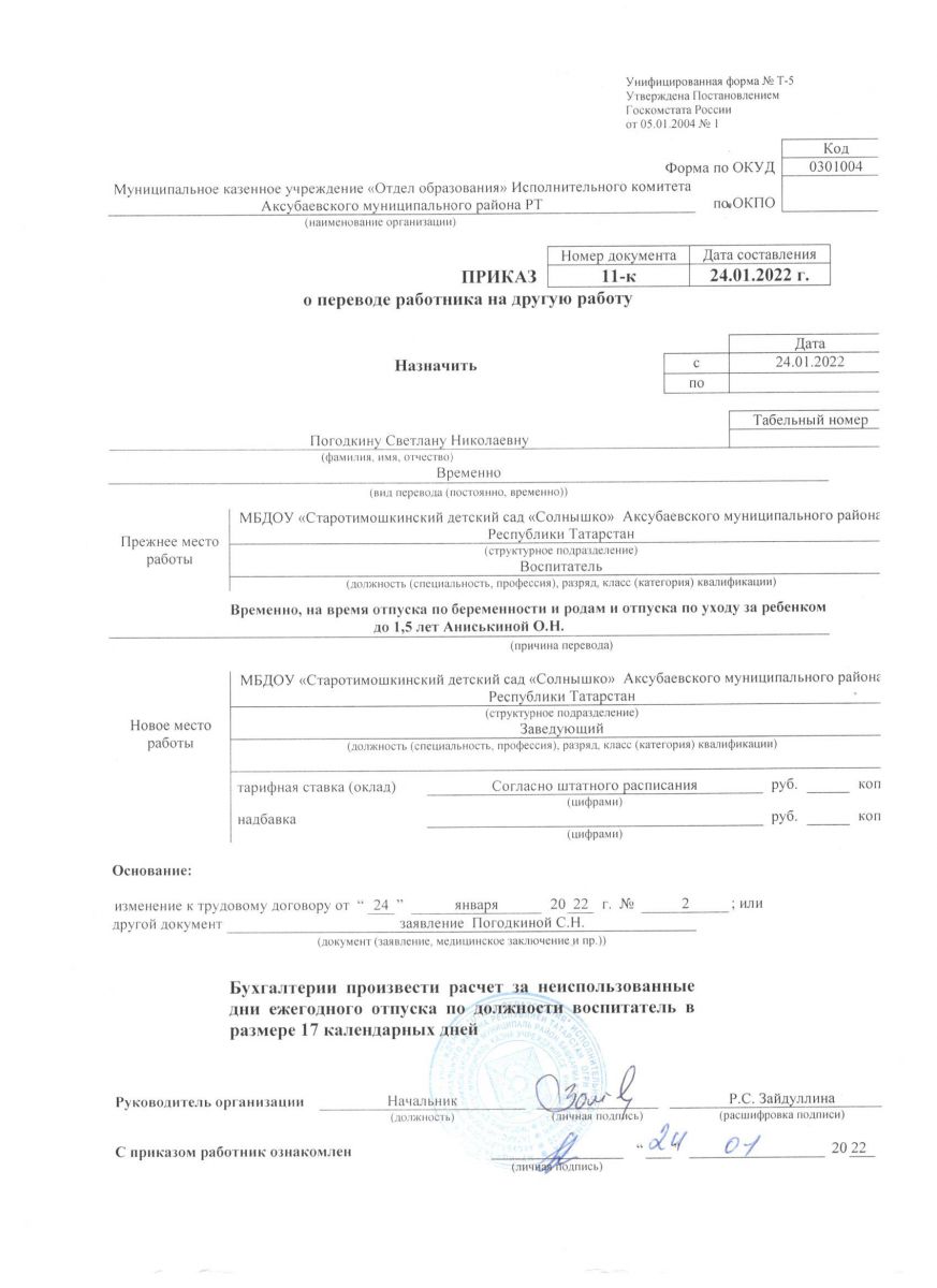 Приказ о назначении руководител я №11-к от 24.01.2022г.