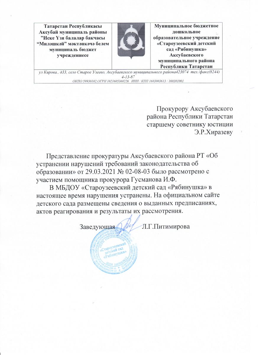 Ответ на представление Прокуратуры от 29.03.2021г. №02-08-03
