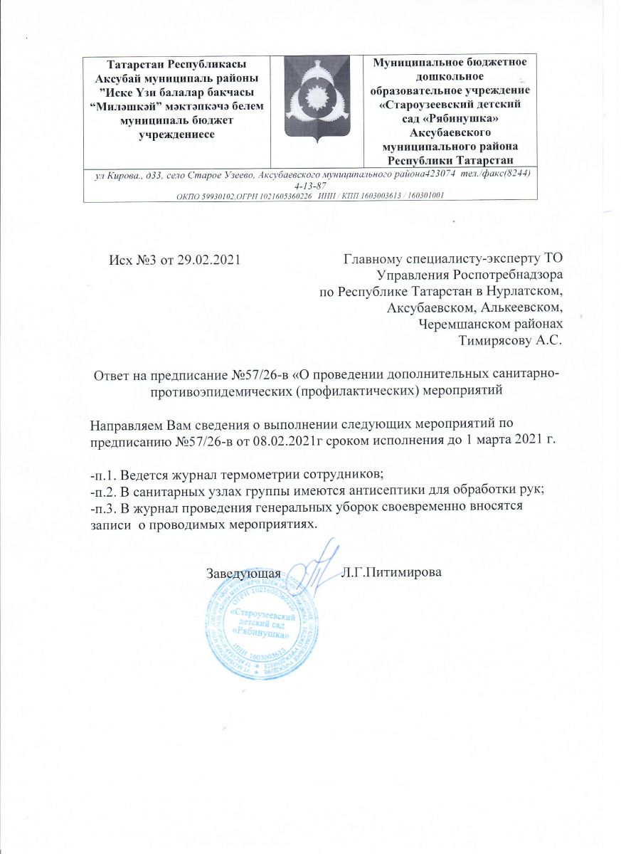 Ответ (исх. №3 от 29.02.2021г.) на предписание Роспотребнадзора №57/26-в от 08.02.2021г