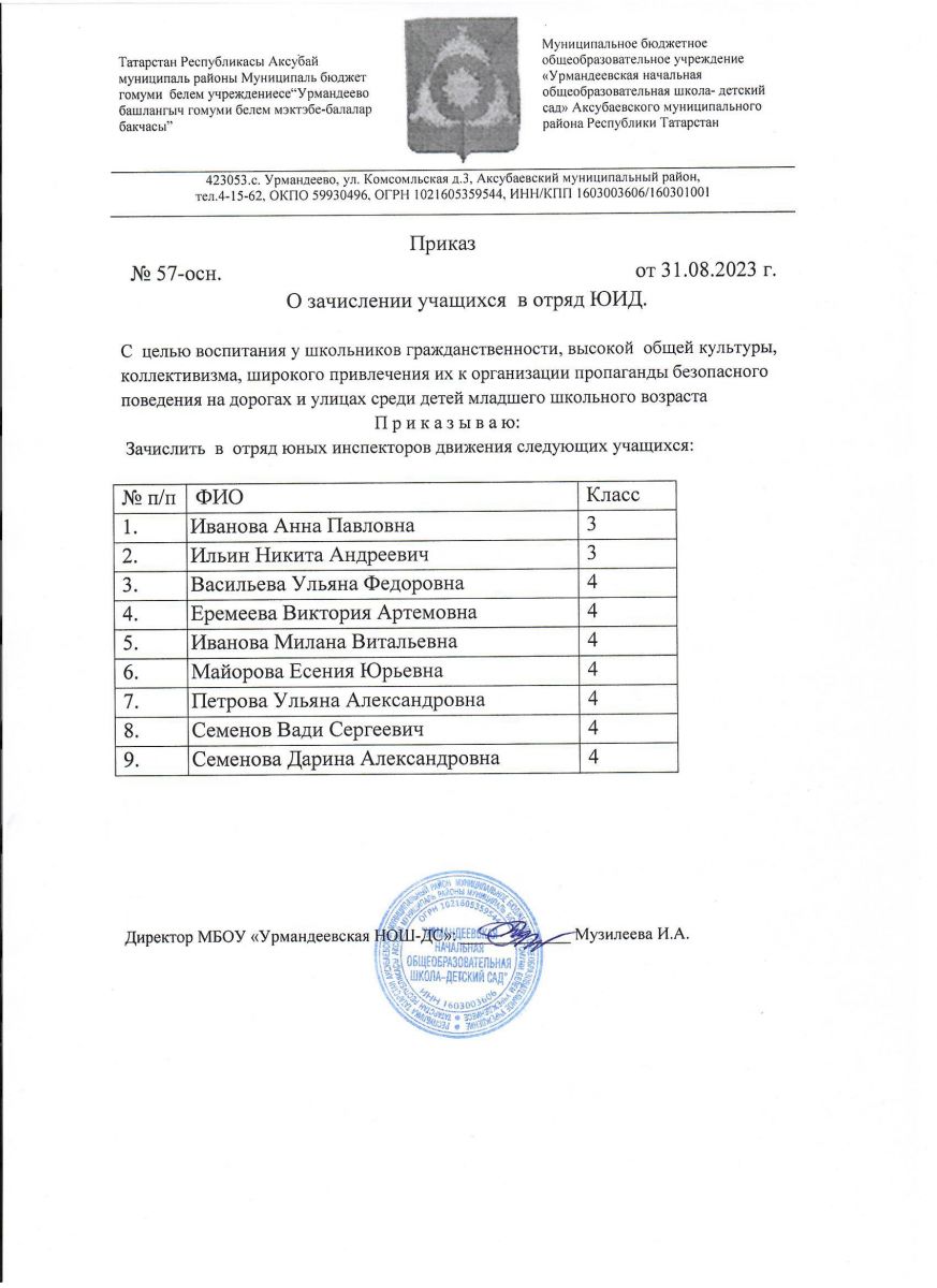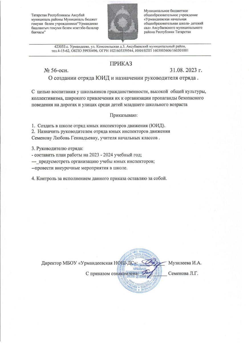 Приказ о создании отряда ЮИД и назначении руководителя отряда