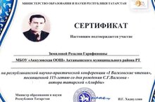 7 ноября 2023 года учитель истории и обществознания МБОУ «Аккузовская ООШ» Зямилова Розалия Гарифяновна получила сертификат за участие в республиканской научно- практической конференции «I Вагизовские чтения», посвященной 115 - летию автора татарской «Алифбы» С.Г. Вагизову.///