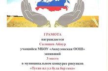 25 апреля 2023 года на муниципальном конкурсе рисунков «Туган ил ул була бер генә» ученик 2 класса Салишев Айнур занял 3 место. Руководитель Гарипова Г.Ф. Поздравляем!///