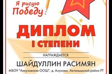 В республиканском конкурсе рисунков «Я рисую Победу», посвященному 78-й годовщине Победы в ВОВ ученица 3 класса Гайсина Язиля заняла 1 место, ученик 6 класса Шайдуллин Расимян занял 1 место, а ученик 3 класса Гарипов Камиль и ученица 5 класса Шайдуллина Назлыгуль получили сертификаты участника. Руководитель: Шайдуллина Л.Н.. Поздравляем! ///