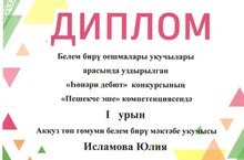 Бөек Ватан сугышында Җиңүнең 78 еллыгына багышланган «Мин Җиңүне ясыйм» республика рәсем конкурсында 3 нче сыйныф укучысы Гайсина Язилә 1 нче урынны, 6 нчы сыйныф укучысы Шәйдуллин Рәсимян 1 нче урынны, ә 3 нче сыйныф укучысы Гарипов Камил һәм 5 нче сыйныф укучысы Шәйдуллина Назлыгөл катнашучы сертификатларын алдылар. Җитәкчесе: Шәйдуллина Л.Н.. Котлыйбыз!