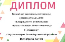 2023 елның 1-2 мартында «Актаныш технология техникумы» да гомуми белем бирү учреждениеләре укучылары арасында «Профдедют» һөнәри конкурсы үткәрелде. Конкурста 25 гомуми белем бирү учреждениесеннән 103 укучы катнашты. Жюри беркетмәләре нигезендә, безнең мәктәптән 9 сыйныф укучысы Исламова Зәлия «Бухгалтер учеты» буенча номинат булды. Җитәкчесе Җәмилова Р. Г. Котлыйбыз!