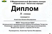 Принимая участие во II Межрегиональном фестивале - конкурсе "Туган тел - народное богатство", организованном Министерством образования и науки Республики Татарстан и Управлением образования Исполнительного комитета Кайбицкого муниципального района, ученица 8 класса МБОУ “Аккузовская ООШ” Ахметова Айзиля Ильвировна была удостоена диплома II степени. Руководитель: Ахметова Чулпан Инсафовна.///
