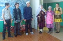9 сыйныф укучылары Т. Миңнуллиның "Бәхетле кияү"дип исемләнгән комедиясен сәхнәләштереп, укучылар, укытучылар, ата-аналарга тәкъдим иттеләр. Җитәкчесе ( Галиева Л.И.)