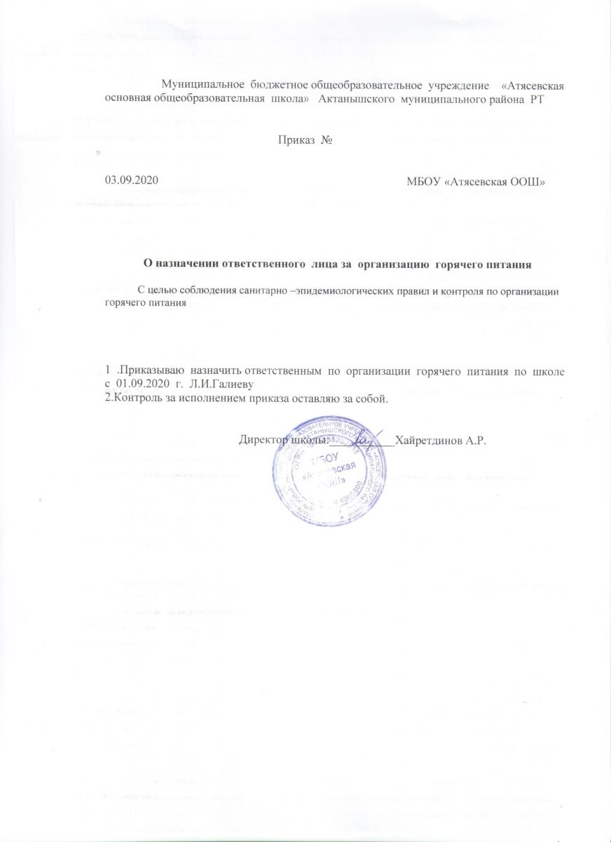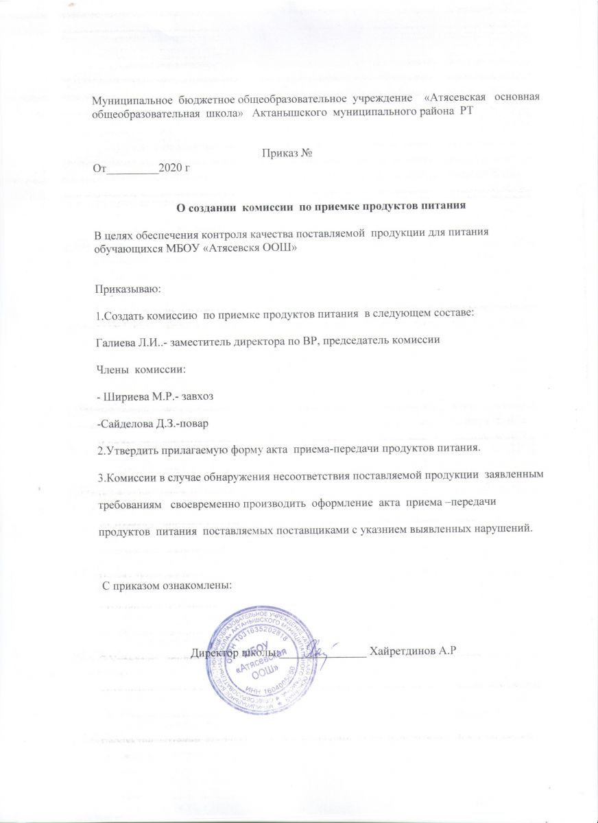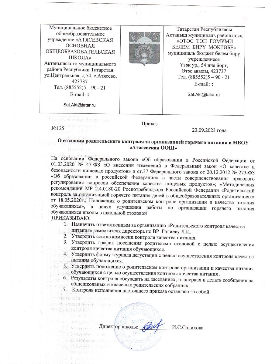 Приказ о создании родительского контроля за организацией горячего питания в МБОУ "Атясевская ООШ"