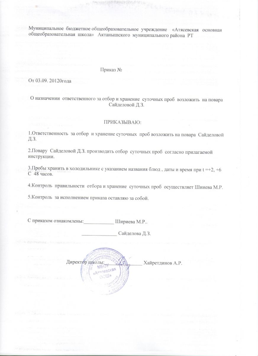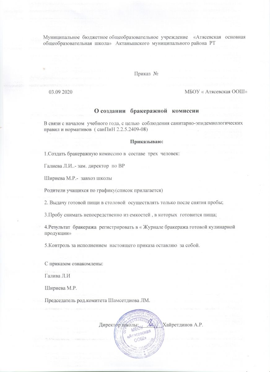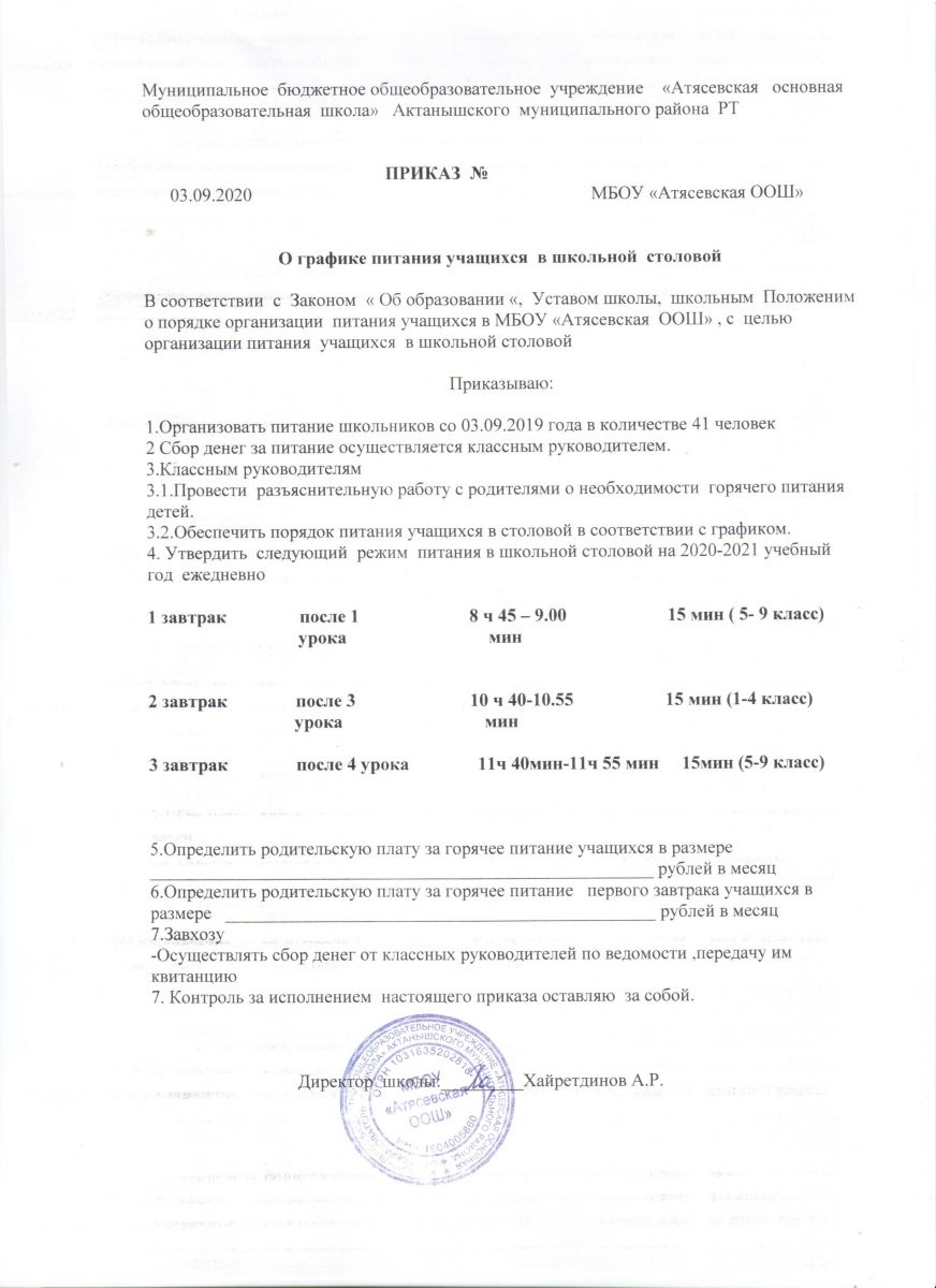 Приказ о создании родительского контроля за организацией горячего питания в МБОУ "Атясевская ООШ"