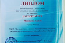 Биология фәненнән олимпиадада 9 нчы класс укучысы – А.М.Манихова катнашты. Аңа уңышлар телибез./Ученица 9 класса А.М.Манихова участвовала на муниципальном этапе по биологии. Желаем успехов.