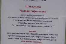 Классный руководитель начальных классов Шавалиева Ч.Р. лауреат на муниципальном этапе Республиканского конкурса профессионального мастерства работников сферы воспитания и дополнительного образования детей “Воспитать человека” награждена Почётной грамотой управлением образования муниципального района.