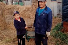 Укучыларыбыз өлкәннәргә ярдәм итүләрен дәвам итәләр. И.Денис бабасына теләп булыша./Наши школьники продолжают помогать пожилым людям. И.Денис охотно помогает дедушке.