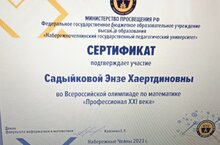 Математика укытучысы - Э.Х.Садыйкова Бөтенроссия математика олимпиадасы “XXI гасыр профессионалы”нда катнашты.Учитель математики Э.Х.Садыйкова участвовала во Всероссийской олимпиаде по математике “Профессионал XXI века”.