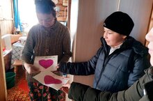 VI класс укучылары М.Х.Хуҗинага открытка бүләк иттеләр. Класс җитәкчесе – Р.С.Әмирова./Ученики VI класса подарили открытку М.Х.Хузиной. Классный руководитель: Р.С.Амирова.