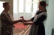 Бәйрәмгә килгән лаеклы ялдагы укытучыбыз Наилә апа Афзалованы каршы алабыз./ Встречаем заслуженного учителя, пришедшего на праздник.