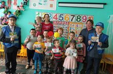 ЮИД отряды членнары нәниләрне юлда йөрү кагыйдәләре һәм билгеләре белән таныштырдылар./Члены отряда ЮИД ознакомили малышей с правилами дорожного движения и знаками.