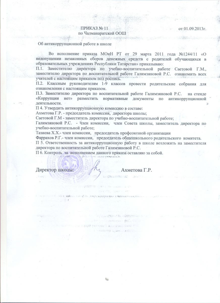 Приказ №11 от 1 сентября 2013 года об антикоррупционной работе в школе