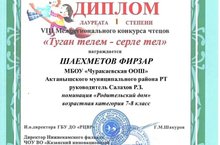 Түбән кама шәһәрендә узган "Туган телем- серле тел" дип исемләнгән сәнгатьле итеп шигырь сөйләүчеләрнең республика конкурсында Чуракай мәктәбенең 8 класс укучысы Шаехметов Фирзәр катнашып, 7-8 класс укучылары арасында 1 урынга лаек дип табылды.