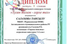 Ученица 4 класса нашей школы Салахова Тансылу заняла 1 место среди учащихся 1-4 классов на республиканском конкурсе чтецов "Туган телем- серле тел", который прошел в Нижнекамске.