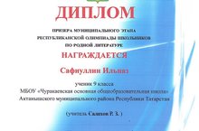 Татар әдәбияты фәненнән 9 нчы сыйныф укучысы Сафиуллин Илназны призер булуы белән котлыйбыз. Укытучысы Салахов Р.З.