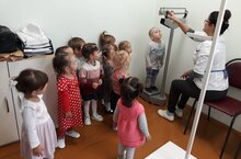 Сегодня малыши первой младшей группы побывала в кабинете старшей медсестры. Медсестра Рамиля Рашитовна измерила рост и вес детей. Была и беседа о чистоте. Детям она посоветовала ходить с расчесанными волосами, подстригать ногти и мыть руки.