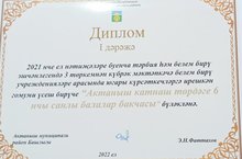 2021нче ел нәтиҗәләре буенча тәрбия һәм белем бирү эшчәнлегендә 3 төркемнән күбрәк мәктәпкәчә белем бирү учреждениеләре арасында балалар бакчабыз алдынгылар җыенында беренче дәрәҗә диплом белән бүләкләнде! Әлеге зур уңышка ирешүдә күп көч куйган коллективыбыздагы барлык хезмәттәшләребезгә дә зур рәхмәтебезне белдерәбез!