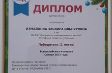 Мәктәпкә әзерлек төркеменнән Измайлова Эльвира үзенең кул эшләнмәсе белән "Ел символы -2022" Бөтенроссия конкурсында 1нче урын яулады. Тәрбиячесе: Шәйхетдинова Ч.Т.