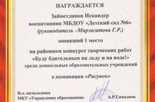 На районном этапе конкурса "Будь бдительным на льду и на воде" в номинации "Рисование" воспитанник логопедической подготовительной к школе группы Зайнетдинов И. занял 1 место, в номинации "Видеоролик" воспитатель Шайхутдинова Г.Р., инструктор по физкультуре Шайхутдинова Р.Ф. заняли 2 место. Поздравляем!