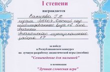 Авторская игра воспитателя Вахитовой Г.Х. заняла 1 место на республиканском конкурсе на лучшую разработку дидактической игры «Семьеведение для малышей» в номинации «Лучшая словесная игра».