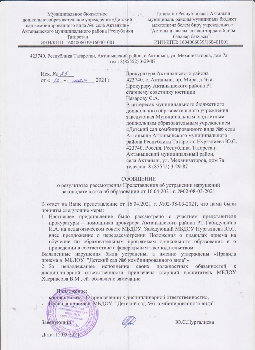 Муниципальное бюджетное дошкольное образовательное учреждение «Детский сад комбинированного вида №6 села Актаныш» Актанышского муниципального района Республики Татарстан/Татарстан Республикасы Актаныш муниципаль районы бюджет мәктәпкәчә белем бирү учреждениесе "Актаныш катнаш төрдәге 6 нчы балалар бакчасы"