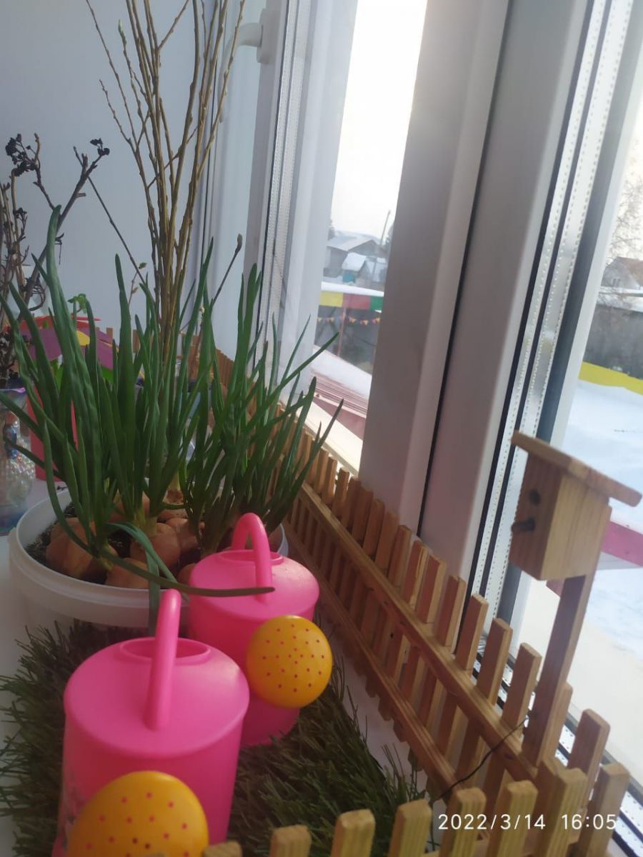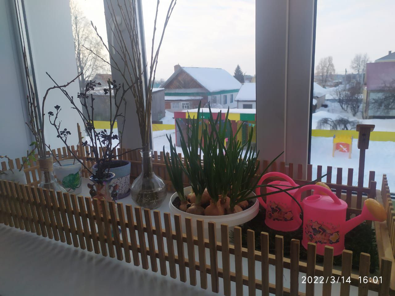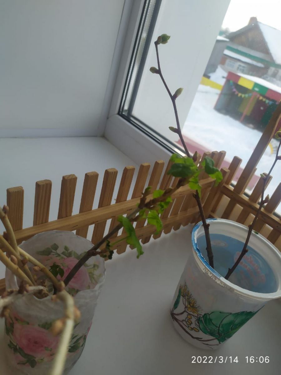 На подоконниках старшей логопедической группы - весна! Лук, который посадили дети, дал зелень, а ветки ипы, рябины, смородины, ивы, березы готовятся к распусканию листьев. Каждый день дети с интересом наблюдают за преображениями саженцев, веток деревьев, которые они принесли. Воспитатели: Мухаметова Л.Р.