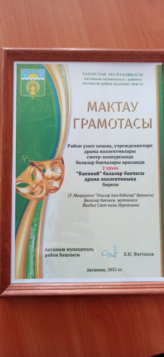 В Актанышском районе подвели итоги месячника, ставшего прекрасной театральной весной для организаций и предприятий, трудовых коллективов. По итогам среди детских садов наш драматический коллектив со спектаклем "Әниләр һәм бәбиләр" Туфана Миннуллина занял 2-е место! Наши коллеги Айгуль Насибуллина (за роль Валентины), Ландыш Кирамова (за роль Дилеммы) были награждены в номинации "Лучший исполнитель своей роли". Наш воспитатель Шайхутдинова Гузель Робертовна, исполнившая роль Гульфины, награждена в номинации "Лучшая женская роль"! Поздравляем!