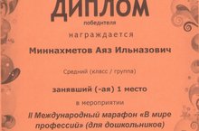 Воспитанники старшей группы Миннахметов Аяз, Хасанов Раяз приняли участие и заняли почетное I место во II Международном марафоне "В мире професиий"(для дошкольников)