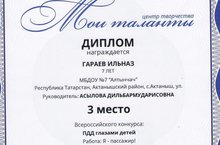 Воспитанник подготовительной группы Гараев Ильназ(руководитель Асылова Д.М.) занял почетное 3 место во Всероссийском конкурсе "ПДД глазами детей" с работой "Я-пассажир". Поздравляем Ильназа с Победой !