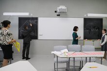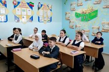 Әлеге фотода 7А сыйныфы укучылары класс җитәкчесе Алсу Рәскать кызы Хәррасова белән дәрес вакытында. -