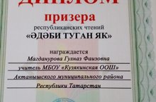 В конкурсе республиканских чтений "Әдәби туган як" от нашей школы Магданурова Гульназ Фаизовна награждена дипломом.
