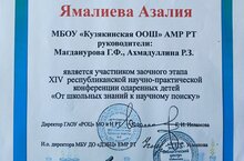 Алабуга шәхәрендә үткән "Мәктәп белемнәреннән фәнни эзләнүләргә" XIV республика фәнни-гамәли практик конференциядә укучыбыз Ямалиева Азалия катнашып сертификатка ия булды.